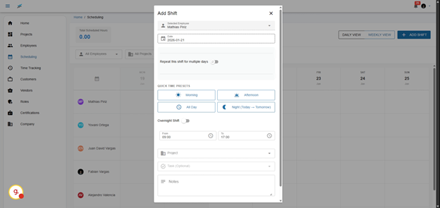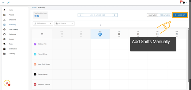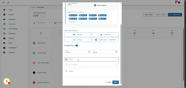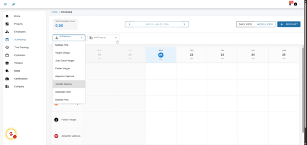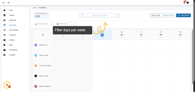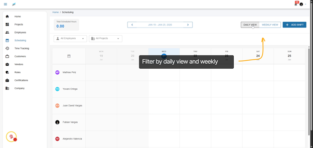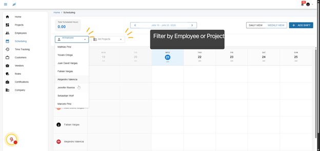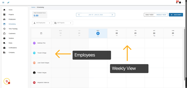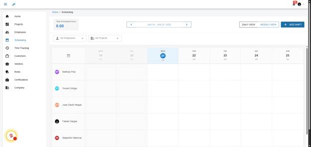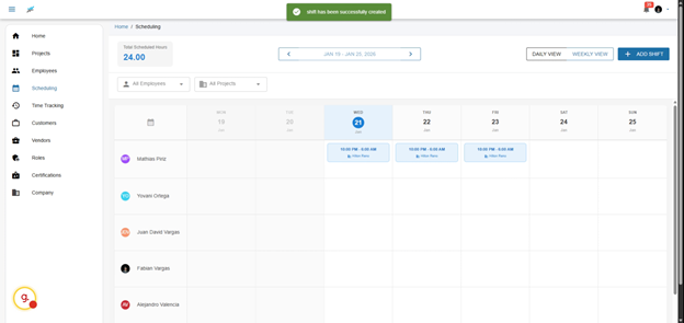 Welcome to the scheduling feature. This tool provides a seamless experience where you’ll see all of your employees on the left side and the weekly view on the top. You can easily drag and drop shifts, making adjustments on-the-fly to accommodate changes in project demands or employee availability.
