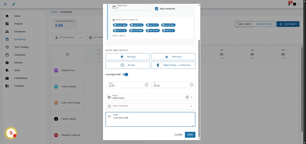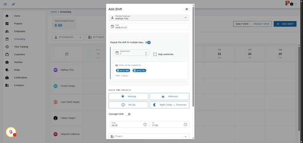 You can set shifts for a duration of up to 7 days, allowing for longer projects without needing constant adjustments. This feature is especially beneficial for roles that require sustained focus over multiple days.