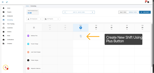 To create a new shift, you can manually add one by clicking this button. Alternatively, navigate to the desired date and click the + button. This flexibility ensures that you can adapt to sudden changes in project requirements or employee schedules with ease.