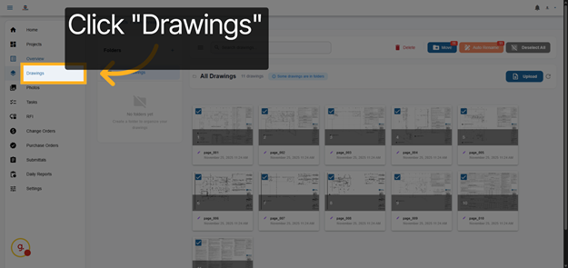 Navigate to the Drawings section where you manage your project files and prepare for renaming.